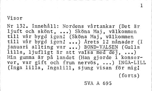 //// 1 //// Visor //// Nr 132. Innehåll: Nordens vårtankar (Det är ljuft och skönt, ...) Sköna Maj, välkommen till vår bygd igeni (Sköna Maj, välkommen till vår bygd igen.' ,..) Arets 12 månader (I januari allting var ...) BOND-VALSEN (Gulla lilla, ljufligt är att valsa med dej, ...) Min gumma är på landet (Han gjorde i konserver, var gift och frun nervös, ...) INGA-LILL (Inga lilla, Ingalill, sjung visan för migl //// (forts) //// SVA A 695 ////
