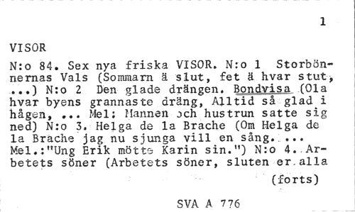 //// 1 //// VISOR //// N:o 84. Sex nya friska VISOR. N:o 1 Storbön-nernas Vals (Sommarn ä slut, fet ä hvar stut, ...) N:o 2 Den glade drängen. Bondvisa fOla hvar byens grannaste dräng, Alltid så glad i hågen, ... Mel; Mannen och hustrun satte sig ned) N:o 3. Helga de la Brache (Om Helga de la Bräche jag nu sjunga vill en sång.;... Mel.:"Ung Erik mötte Karin sin.") N:o 4. Arbetets söner (Arbetets söner, sluten er.alla //// (forts) //// SVA A 7 76 ////