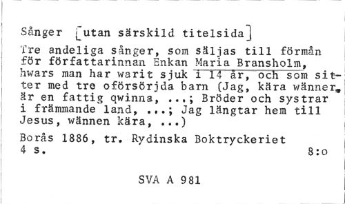 //// Sånger [utan särskild titelsidaj //// Tre andeliga sånger, som säljas till förmån för författarinnan Enkan Maria Bransholm, hwars man har warit sjuk i 14 år, och som sitter med tre oförsörjda barn (Jag, kära wänner. är en fattig qwinna, Bröder och systrar //// i främmande land, ...; Jag längtar hem till Jesus, wännen kära, ...) //// Borås 1886, tr. Rydinska Boktryckeriet 4 s. 8:o //// SVA A 9 81 ////