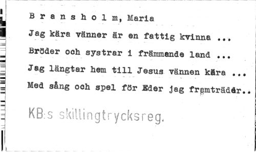 //// [J Bransholm, Maria I Jag kära vänner är en fattig kvinna ... Bröder och systrar i främmande land ... Jag längtar hem till Jesus vännen köra ... | Med sång och spel för Eder jag frgmträdår.. //// 1 KB:s skiilingtrycksreg, //// — ////