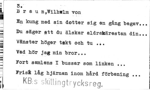 //// ; 3. //// jj B r a u n,Wilhelm von //// En kung med sin dotter sig en gång begav... = Du säger ett du älskar aldråkarestan din... | Vänster höger takt och tu ... 2 Vad hör jag min bror... //// Fort samlens I bussar som linken ... Frist låg hjärnan inom hård förbening ... //// i KB.s skillingtrycksreg. ////