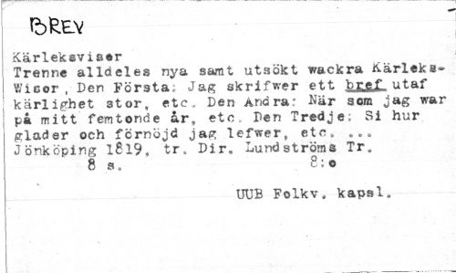 //// tbtev //// Kärleksvisor //// Trenne alldeles nya samt utsökt vackra Kärleka» Wisor, Den Första; Jag skrifwer ett brff utaf kärlighet stor, etc. Den Ändrar Kär som jag war på mitt femtonde år, etc. Den Tredje; Si hur gläder och förnöjd jag lefwer„ etc, Jönköping 1819* tr. Dir. Lundströms Tr. 8 s» 8:0 //// UUB Folkv. kapsl. ////