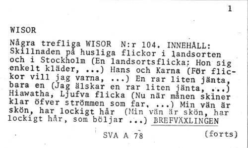 //// 1 //// WISOR //// Några trefliga WISOR N:r 104. INNEHÅLL: Skillnaden pa husliga flickor i landsorten och i Stockholm (En landsortsflicka: Hon sig enkelt kläder, ...) Hans och Karna (För flickor vill jag varna, ...) En rar liten jänta, bara en (Jag älskar en rar liten jänta, ..,) Hiawatha, Ljufva flicka (Nu när månen skiner klar öfver strömmen som far, ...) Min vän är Skön, har lockigt hår (Min vän är skön, har lockigt hår, som böljar BREFVÄXLINGEN //// 1 SVA A 78 (forts) ////