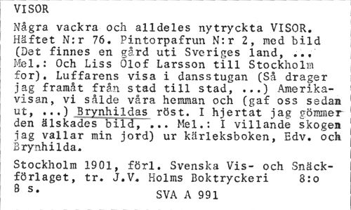 //// VISOR //// Några vackra och alldeles nytryckta VISOR, Häftet N:r 76. Pintorpafrun N:r 2, med bild (Det finnes en gård uti Sveriges land, ... Mel.: Och Liss Olof Larsson till Stockholm for). Luffarens visa i dansstugan (Så drager jag framåt från stad till stad, ...) Amerikavisan, vi sålde våra hemman och (gaf oss sedan ut, ...) Brynhildas röst. I hjertat jag gömmer den älskades bild, ... Mel.: I villande skogen jag vallar min jord) ur kärleksboken, Edv. och Brynhilda. //// Stockholm 1901, förl. Svenska Vis- och Snäck-förlaget, tr. J.V, Holms Boktryckeri 8:o //// 8 s* SVA A 991 ////