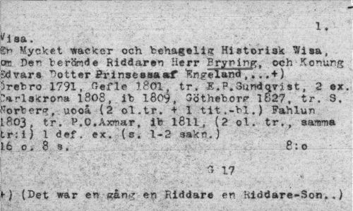 //// u //// 'Isa. //// £n Mycket vacker och behageliar Historisk Wisa, lo Ben berömde Riddaren Herr Bryning. och Konung Sdvars dotter Prinsessa»? 'EngelaSF;... +) Jrebro 1791, ^efle 1?&1 tr. E.?. Sund qvi st, 2 ex. Karlskrona 1808, ib 1809» Sötheb.orr 1S27, tr. S. :orfcerg, uooå (2 ol.tr. + 1 t i t.-bl.) Fahlun //// tr. P.O.Åxmar, ib 1811, (2 ol. tr., samma ; r: i ) 1 def. ex. (s. 1-2 sakn.) 1.6 o. 8 s. 8:0 //// •v i. ¦ för^ iq ]¦s?~ 17 - v . t //// (-)-(Det war en gån^ en Riddare en Kiddare-Son..) ////
