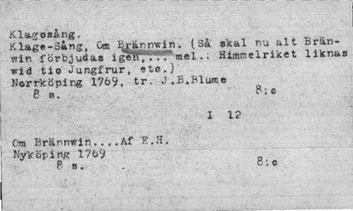 //// Klagosång. //// Klage-Sang, Om feränmtin. (Så skal nu alt Bran-win förbjudas i getff^Tf' me 1.; Himmelriket liknas wid tio Jungfrur, eto.) Norrköping 176?, tr. J.B.Blume //// 6 s. B;c //// I 1? //// Om Brännwin...Af E.H, Nyköping 17 69 //// P s. . 8;c ////