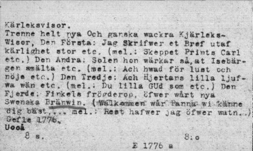 //// Kärlekavisor. //// Trenne helt nya Och ganska wackra Kjärleks-Wiser, Den Första: Jag Skrifwer et Bref utaf kärlighet stor etc. (mel.: Skeppet Prints Carl etc.) Den Andra; Solen hon wärk&r så,at Isebär» gen smälta etc. (mel.: Ach hwad för lust och nöje etc.) Den Tredje: Ach Hjertans lilla ljuf» wa wän etc. (mel.; Du lilla GUd se®! etc.) Den Fjerde. Finkels fröjderop, öfwer wårt nya Swenska Brärwin. ( Wälk«mmen wår Panna- Vi kätsne öig bfcst .. aél.Rest hafwer jag öfwer watn. J £>ef le 1776., Uooa //// s b, 8:0 //// £ 1776 a ////