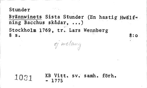 //// Stunder //// Brännwinets Sista Stunder (En hastig Hwälf* ning Bacchus skådar, ..,) //// Stockholm 1769, tr, Lars Wennberg //// 8 s. 8:0 //// gj ( //// 10O1 KB Vitt. sv, samh. förh. - 1775 ////