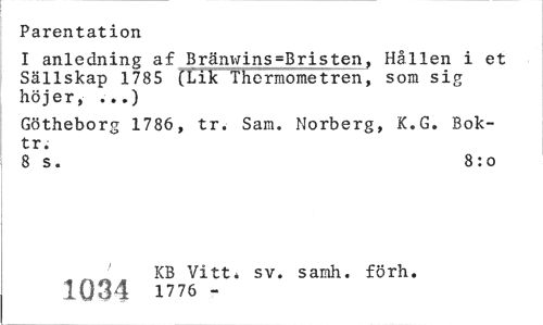 //// Parentation //// I anledning af Bränwins =Bristen, Hållen i et Sällskap 1785 (Lik Thermometren, som sig höjer, ...) //// Götheborg 1786, tr. Sam. Norberg, K.G. Bok-tr. //// 8 s. 8: o //// KB Vitt* sv. samh. förh. //// 1034 1776 - ////