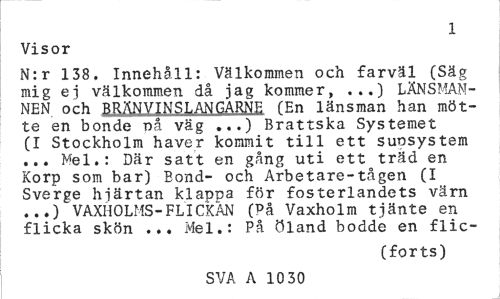 //// 1 //// Visor //// N:r 138, Innehåll: Välkommen och farväl (Säg mig ej välkommen då jag kommer, ...) LÄNSMANNEN. och BRÄNVINSLANGARNE (En länsman han mötte en bonde nå väg ...) Brattska Systemet (I Stockholm haver kommit till ett suosystem ... Mel.: Där satt en gång uti ett träd en Korp som bar) Bond- och Arbetare-tågen (I Sverge hjärtan klappa för fosterlandets värn ...) VAXHOLMS-FLICKAN (På Vaxholm tjänte en flicka skön ... Mel.: På Öland bodde en flic- //// (forts) //// SVA A 10 30 ////