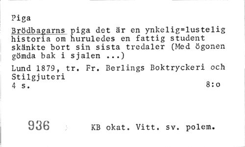 //// Piga //// Brödbagarns piga det är en ynkelig=lustelig historia om huruledes en fattig student skänkte bort sin sista tredaler (Med ögonen gömda bak i själen ...) //// Lund 1879, tr. Fr. Berlings Boktryckeri och Stilgjuteri //// 4 s. 8:0 //// 936 KB okat. Vitt. sv. polem. ////