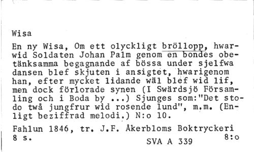 //// Wisa //// En ny Wisa, Om ett olyckligt bröllopp, hwar-wid Soldaten Johan Palm genom en bondes obetänksamma begagnande af bössa under sjelfwa dansen blef skjuten i ansigtet, hwarigenom han, efter mycket lidande wäl blef wid lif, men dock förlorade synen (I Swärdsjö Församling och i Boda by ...) Sjunges som:"Det sto-do twå jungfrur wid rosende lund", m.m. (Enligt beziffrad melodi.) N:o 10. //// Fahlun 1846, tr. J.F. Åkerbloms Boktryckeri //// 8 s* SVA A 339 8:0 ////