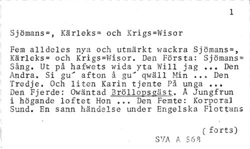 //// 1 //// Sjömans=, Kärleks= och Krigs=Wisor //// Fem alldeles nya och utmärkt wackra Sjömans=, Kärleks15 och Krigs=Wisor. Den Första: Sjömans-Sång. Ut på hafwets wida yta Will jag ... Den Andra. Si gu^ afton å gu' qwäll Min ... Den Tredje. Och liten Karin tjente På unga ... Den Fjerde: Owäntad Bröllopsgäst. Å Jungfrun i högande löftet Hon ... Den Femte: Korpcral Sund. En sann händelse under Engelska Flottans //// ( forts) //// SVA A. 56 8 ////