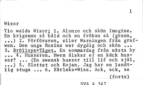 //// 1 //// Wisor //// Tio walda Wisor; 1. Alonzo och skön Imogine. En krigsman så båld och en frökan så (grann, ...) 2. Förföraren, eller Warningen från graf-wen. Den unga Rosina war dygdig och skön ... 3. Bröllopståget. En sommardag från nästa by ... 4. Hussaren. Hwem älskar ej en käck hussar? ... (En swensk hussar till lif och själ, ..,) 5, Slottet och Kojan. Jag har en landt-lig stuga ... 6. Kärleks=Wisa. Ack, ack, se //// (forts) //// pirA A t A n ////