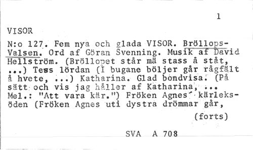 //// 1 //// VISOR //// N:o 127. Fem nya och glada VISOR. Bröllops-Valsen. Ord af Göran Svenning. Musik af David Hellström. (Bröllopet står mä stass å ståt, .,.) Tess lördan (i bugane böljer går rågfält å hvete, ...) Katharina. Glad bondvisa; (På sätt och vis jag håller af Katharina, ... Mel.: "Att vara kär.") Fröken Agnes"* kärleksöden (Fröken Agnes uti dystra drömmar går, //// (forts) //// SVA A 708-___ ////