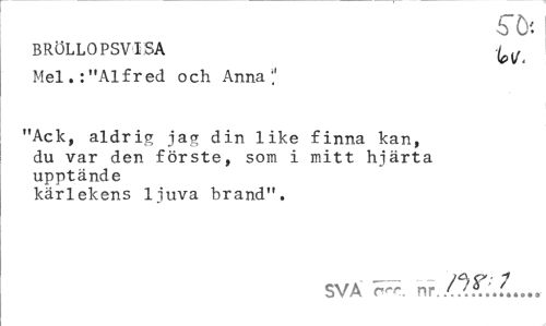 //// 5*0'. //// BRÖLLOPSVISA ^ //// Mel.: "Alfred och Anna //// "Ack, aldrig jag din like finna kan, du var den förste, som i mitt hjärta upptände //// kärlekens liuva brand", //// SVA ~cr~r. nr. ////