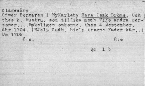 //// K la ge sång //// Cfwer Borgaren i NyKarlety Har,g Isak Broms. Och thes k. Hustru, som tillika medh TiJ© ardra personer ömkeligen omkomne, then 4 oeptember, &hr 1704. (HJelp ttudh, bielp trogne Fader kär,.j Uo 1706 //// 8 s. 8:o //// Qc Ib ////