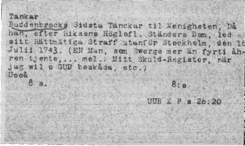 //// Tankar //// Buddenbrocka Sidsta Tanckar til Menigheten, Då harf^ efter hikaens Höglofl. Ständers Dom, led sitt Rätt*natigu Straff utanför Stockholm, dén 1 Juli i 1^43 . (EK Man , acsn Sw-erge mer än fyrti ah ren tjente, ... mel.; Mitt Skuld-Register, när jas wil o GUD fcé3kåda, etc.) ¦ 'Jooå //// 1 e s. s8.0 //// UUB Z Va 26;20 ////