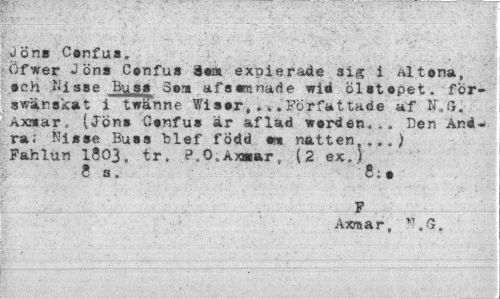 //// Jon» Csnfus. //// Öfwer JönS Confus dem expierade 3ig i AL tona, sch iiisse Buss 3s» af a ämnade wid Ölstopet. för-swänskat i twänne Wissr.Författade af N',G. Axaiar, (Jön» Csnfus är aflad vorden... Den Andra; Ni*»e Buss blef född sra natten ...) Fahlun 1803, tr. ?„0,Ax>»art (2 ex.) //// 8 s. 8; s //// F //// Axraar, ^.<5. ////
