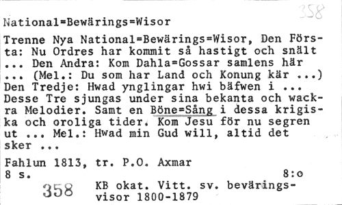 //// National=Bewärings=Wisor //// Trenne Nya National=Bewärings=Wisor, Den Första: Nu Ordres har kommit så hastigt och snält ... Den Andra: Kom Dahla^Gossar samlens här ... (Mel.: Du som har Land och Konung kär ...) Den Tredje: Hwad ynglingar hwi bäfwen i ... Desse Tre sjungas under sina bekanta och wack-ra Melodier. Samt en Böne-Sång i dessa krigiska och oroliga tider* Kom Jesu för nu segren ut ... Mel.: Hwad min Gud will, altid det sker ... //// Fahlun 1813, tr. P.O. Axmar 8 s. 8:0 //// QS^W KB okat. Vitt. sv. bevärings-000 visor 1800-1879 ////