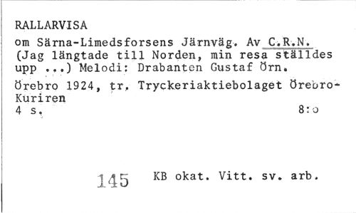//// RALLARVISA //// om Särna-Limedsforsens Järnväg. Av C.R.N. (Jag längtade till Norden, min resa ställdes upp .,.) Melodi; Drabanten Gustaf örn. //// Örebro 1924, tr. Tryckeriaktiebolaget Örebro-Kur i ren //// 4 s, 8:0 //// • g KB okat. Vitt. sv. arb. ////