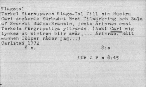 //// Klagotal //// Torkel Storsupares Klago-Tal Till sir> Hustru Cari Angående Förbudet Emot Tilwarkning och Salu af Swen^kt Säd es-Brätiwin, jemte Ärinran emot Torkels ftirgrip#liga yttrande. (Ackl Cari mig tyckes at wintren blir swår,,,. Ärirrän "'"Hålt munnen Tölper råder Jag.,,) Carlstad 1772 //// 8 s. 8: o //// UUB 2 P a 8;45 //// k. ////
