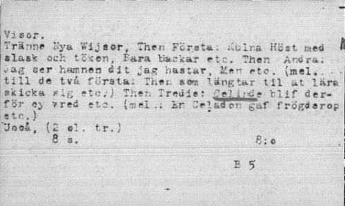 //// Visor. //// Tränne Kya Wijsor, Then Första; iCuIr.a Höst med ' slask och tSken, Fara tiackar etc. Then Andra, v-ag ser hamnen cit Jag hastar, lie»- etc. (mel. till de två första; Thet. sem längtar til at lär» skicka »»ig etc;) Then Tredier .CeJ ie fclif der-för ej- vred etc. (mel Lr Celader g af f rögderog etc.) //// "Joeå, (2 el. tr.) //// 8 s., 8;© //// B 5 ////