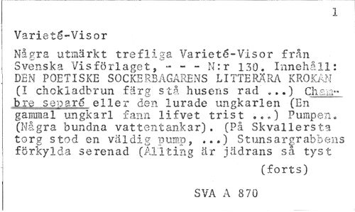 //// 1 //// Varieté-Visor //// Några utmärkt tre£1.1 ga Varieté-Visor från Svenska Visförlaget, - - - N:r 130. Innehåll: DEN POETISKE SOCKERBAGARENS LITTERÄRA KROKAN (I cliokladbrun färg stå husens rad ...) Ch :. b re se~oaré eller den lurade ungkarlen (En gammal ungkarl fann lifvet trist ...) Pumpen. (Några bundna vattentankar). (På Skvallers ta torg stod en väldig pump, ...) Stunsargrab o e n s förkylda serenad (Allting är jädrans så tyst //// (forts) //// SVA A 8 70 ////