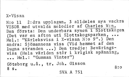 //// X-Visan //// N:o 11 2:dra upplagan. 3 alldeles nya vackra VISOR med utvalda melodier af Charles W:n. Den första: Den underbara synen i Slottskögen (Det var en afton uti Slottskogsparken, ... Mel*: "Kärleksvisa i X-visan N:o 9".) Den andra: Sjömannens visa (Vid hemmet af den lugna stranden ...) Den tredje: Bevärings-visa (Hela världen står i krigisk spänning, ... Mel.: "Gumman Vinter") //// Göteborg u.å., tr. Joh. Olsson 8 s. 8:o //// SVA A 751 ////