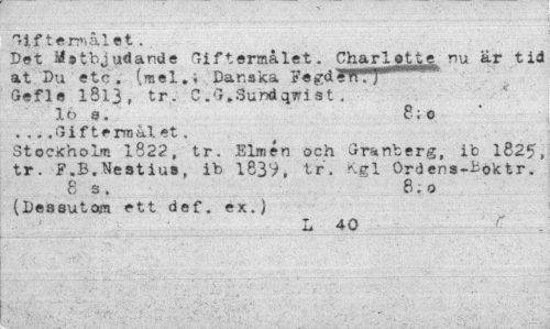 //// Giftermålet . //// Det i4stbjudan.de Giftermålet. Charlotte, nu är tid at Du etc. (mel»i Danska Fegdé'W'17' Gefle 1813, tr. C.'5»Sundqwist. //// lös. 8;o //// . .. ,Gi ftermål et. //// Stockholm 1822, tr. Elmén och Granberg, ib 1825, tr. F.B.Nestius, ib 183V, tr. K.gl Ordens-Boktr. //// 8 s. 8.0 //// (Dessutom ett def. ex.) //// l 40 r ////