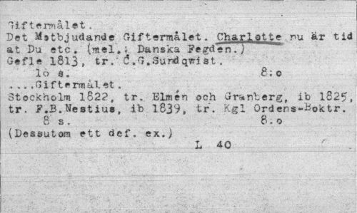 //// Giftermålet . //// Det Mstbjudande Giftermålet. Charlotte nu är tid at Du etc. (mel»; Danska Fejden.) Gefle 1813, tr." 6 .G.Sundqvri st . //// los. 8;o //// . .. , G i f t e rra a 1. et . //// Stockholm 1822, tr. Elmén och Granberg, ib 1825, tr. jp.3. Nestius, ib 1839, tr. Kgl Ordens-Boktr. //// 8 s. 8.o //// (Dessutom ett def. ex.) //// L 40 ' ////