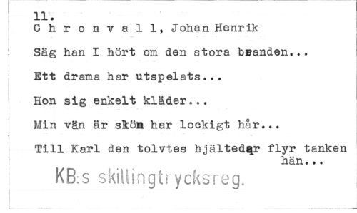 //// 11. //// Chronvall, Johan Henrik //// Säg han I hört om den stora branden... //// Ett drama har utspelats... //// Hon sig enkelt kläder... //// Min vän är sköa har lockigt hår... //// Till Karl den tolvtes hjälted^r flyr tanken //// hän... //// KB:S skillingtrycksreg. ////