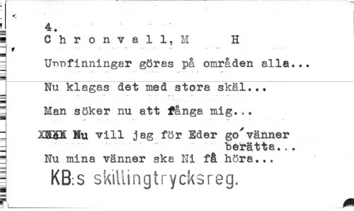 //// < //// 4. //// | Chronvall, M H //// i t //// Unnflnningar göras på områden alla... //// Nu klagas "det med stora skäl... //// _ Man söker nu att fånga mig... //// : X35SK Hu vill jag för Eder go'vänner : berätta... //// 3 Nu mina vänner ska Ni få höra... //// - KB:S skillingtrycksreg. //// ii___ ////