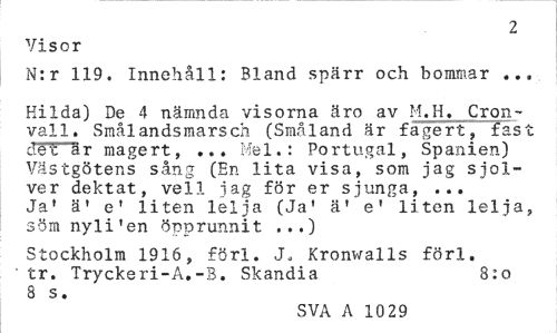 //// 2 //// Visor //// N:r 119. Innehåll: Bland spärr och bommar ... //// Kilda) De 4 nämnda visorna äro av H.H, Cron-val1. Smålandsmarsch (Småland är fagert, fast cl et ar magert, ... Mel.: Portugal, Spanien) Västgötens sång (En lita visa, som jag sjol-ver dektat, vell iag för er sjunga, ... Ja' ä' e' liten lelja (Ja1 ä1 e' liten lelja, söm nyli'en öpprunnit ...) //// Stockholm 1916, förl. J. Kronwalls förl. ¦ tr. Tryckeri-A.-B. Skandia 8:o //// 8 s //// SVA A 10 29 ////