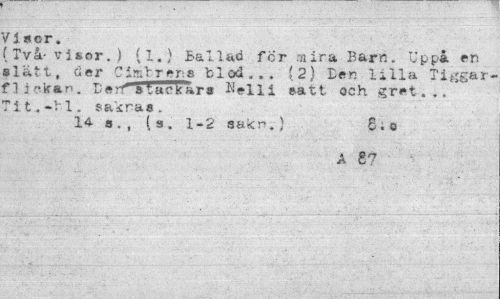 //// ( Två- vit,or. ) >1.) Ballad för mixa Barn. Uppa en •lätt, der CimVrens blod... (2) Ben lilla Tiggar-flickan. L t ack ars Nelli eatt och gr et-. .. Tit., »bl. sakna». //// 14 s., (s. 1-2 aakn.) 6;o //// A g? ////