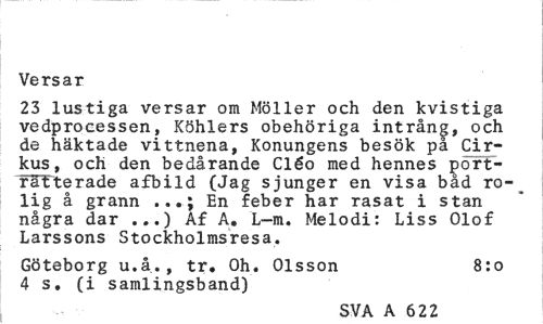 //// Versar //// 23 lustiga versar om Möller och den kvistiga vedprocessen, Köhlers obehöriga intrång, och de häktade vittnena, Konungens besök på Cirkus, och den bedårande Cléo med hennes port-rénrterade afbild (Jag sjunger en visa båd ro-^ lig å grann En feber har rasat i stan //// några dar ...) Af A, L-m. Melodi: Liss Olof Larssons Stockholmsresa. //// Göteborg u.å., tr. Oh. Olsson 8:0 //// 4 s. (i samlingsband) //// SVA A 6 622 ////