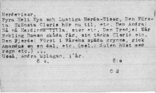 //// Herd ev i s or. //// Fyra Helt Nya och Lustiga Hercsi»7'isor, Den Första Skönsta Cloris hör nu til, etc. Den Andra: Ni na Herd inffS~m la , stor »tc. Den Tredje; Wår Fnkling Damen skåda får, sin täcka Cloris etc, Den Fjerde; Först i Warens späda grynne, gick Amandus em en dal, etc. (mel.: Kulen höst med regn etc.) ... Useå, Andra Uplagan, i*år, //// 8 s, 8:0 //// C 2 ////