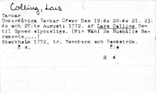 //// Co^JXua ( Lcu^ //// Tankar //// Underdåniga Tackar Öfwer Den 19;de 20;de 21. 23: de ech 2?:te Augusti 1772. Af Lar» Celling Den til Synen elyckelige. (Fin Wanl Se Huahålla Re-gem en te ,. ..) //// Steckhelm 1772, tr. Vennberg och Nerdatröm. 8 s. - f:e //// H 4 ////