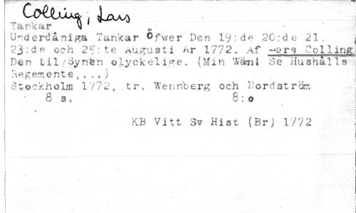 //// Tankar M ^ , ;fwpr Den l^de 2C:de 21. Underdåniga Tankar Ofwer den i, ^^ CoIIing //// 23:(iP och 25:te Augu»ti ___^ //// Ben til'Synen olyckelige. //// SSK&HtSI tr. Wennberg ocn .or.strfc, //// 8 3 . * //// 1 ' KB Vitt 3v Hist (Br) 1/72 //// ; ' ' _... _ . ___ //// i ////