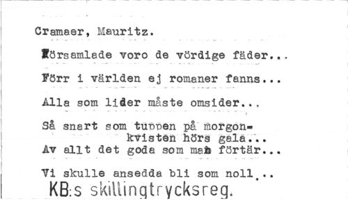 //// Cramaer, Mauritz. //// församlade voro de vördlge fäder... //// Förr i världen ej romaner fanns... //// Alla som lider måste omsider... //// Så snart som tunnan på morgonkvisten hörs gala... Av allt det goda som mat» förtär... //// 7i skulle ansedda bli som noll#.. //// KB:S skillingtrycksreg. ////