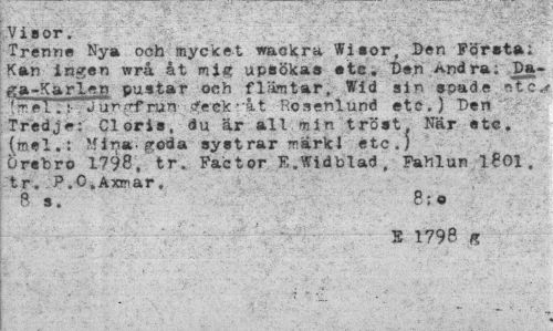 //// Visor. //// Tremie Nya och mycket w&olcra Wisor, Den Först»; Kan ingen wrå åt mig upsökas etc. Den Andra: ,Da-ga-Karlen pustar och flämtar, Wid sin spade >el. !•. Ju r-rfrun tfeck "a t Rosenlund etc.) Den Tredje: Cloris, du är all min tröst. När etc» {mel.: Mi^a.goda systrar märlcJ etc.; örsbro 1798, tr, Factor E.Widblad, Fahlun l8Gl, tr, P.OtAxmar. B s. 8:0 //// S 1798 g ////
