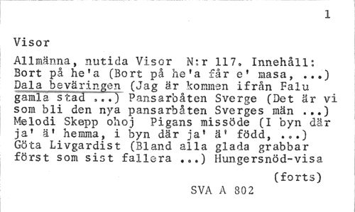 //// 1 //// Visor //// Allmänna, nutida Visor N;r 117. Innehåll: Bort på he'a (Bort på hera får ef masa, ...) Dala beväringen (Jag är kommen ifrån Falu gamla stad ,7.) Pansarbåten Sverge (Det är vi som bli den nya pansarbåten Sverges män ...) Melodi Skepp ohoj Pigans missöde (I byn där ja' ä' hemma, i byn där ja' ä' född, ...) Göta Livgardist (Bland alla glada grabbar fö rst som sist fallera ...) Hungersnöd-visa //// (forts) //// SVA A 80 2 ////
