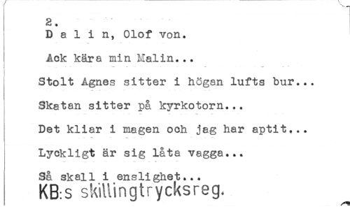 //// 2. //// Dalin, Olof von. Ack kära min Malin... Stolt Ågnes sitter i högan lufts bur... Skatan sitter på kyrkotorn... Det kliar i magen ooh jag har aptit... Lyckligt är sig låta vagga... Så skall i enslighet... //// KB:S skillingtrycksreg. //// /f* ////