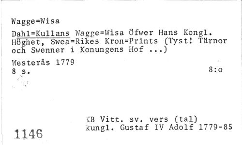 //// Wagge-Wisa //// Dahl=Kullans Wagge=Wisa Öfv/er Hans Kongl. Höghet, Swea=Rikes Kron=Prints (Tyst.1 Tärnor och Swenner i Konungens Hof ...) //// Westerås 1779 //// 8 s. 8:0 //// KB Vitt. sv. vers (tal) . . An kungl. Gustaf IV Adolf 1779-85 //// I 114b ////