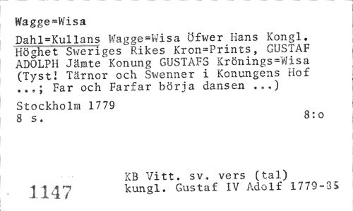 //// Wagge=Wisa //// Dahl=Kullans Wagge=Wisa Öfwer Hans Kongl. Höghet Sweriges Rikes Kron=Prints, GUSTAF ADOLPH Jämte Konung GUSTAFS Krönings-Wisa (Tystl Tärnor och Swenner i Konungens Hof Far och Farfar börja dansen ..,) //// Stockholm 1779 //// 8 s. 8:0 //// KB Vitt. sv. vers (tal) J 147 kungl. Gustaf IV Adolf 1779-35 ////