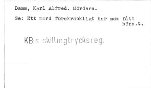 //// Damm, Karl Alfred. Mördare. //// Se: Ett mord förskräckligt har man fått //// höra.ö. //// KB.s skillingtrycksreg. //// i //// i -...— ////
