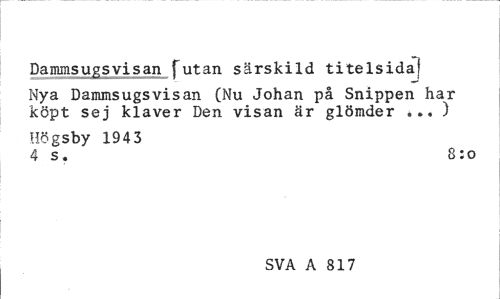 //// Dammsugsvisan futan särskild titelsida! //// Nya Dammsugsvisan (Nu Johan på Snippen har köpt sej klaver Den visan är glömder ... ) //// Högsby 1943 //// 4 s. 8:0 //// SVA A 817 ////