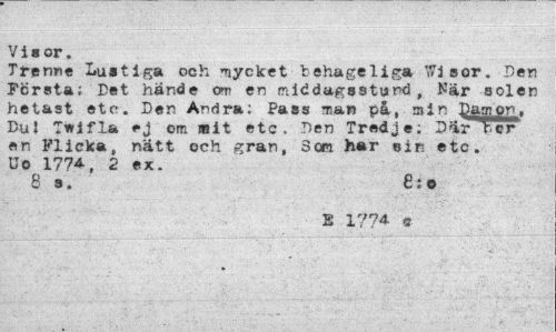 //// Visor. //// Trenrte Lustiga och mycket tehageliga Wjaor. Den Första; Det hände or en middagsstund , Kär solen hetast etc. Den Andra; Pass man på, min Dam or». DuJ Twifla ej om mit etc. Den Tredje; Där W en Flicka, nätt och gran, Som har ein etc. Uo 177*, 2 ex. //// 8 s. 8;o //// E 1774 * ////