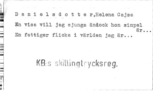 //// g Danielsöotte r,Helena Cajsa //// = En visa vill jag sjunga ändock hon simpel //// är... //// 2 En fattiger flicka i världen jag är... //// 1 //// - KB s skiliingtrycksreg. ////