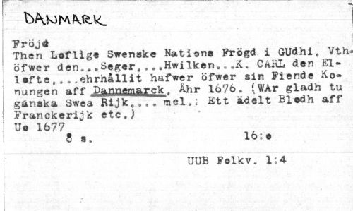 //// Fröjä //// Then Leflige Swenske Nations Frögd i GUdhi, Vth öfwer den...Seger,...Hwilken...K. CaRL den El-lefte,. . .ehrhållit hafwer öfwer sin Fiende Ko» nungen »ff Lann^ma^ic Ähr 1676. (WAr gladh tu ganska Swea Rijk,.., mel.; Ett ädelt Bledh aff Franckerijk etc.) Uo 1677 //// 8 s. 16;e //// UUB Folkv. 1:4 ////